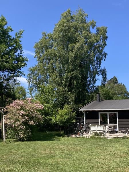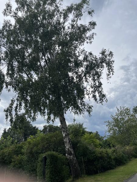 Stort birketræ med bevoksning af efeu skal fældes. Træet står mellem to huse Træet ...
