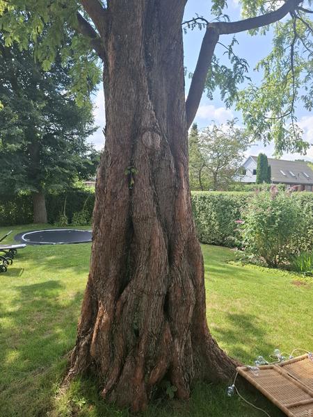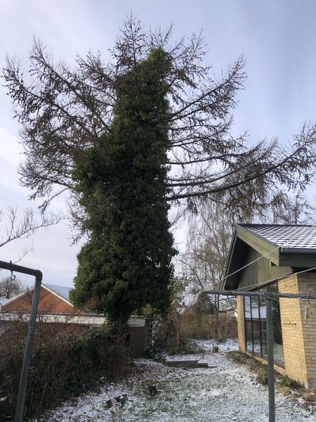 Vi skal have fældet et stort lærketræ, som er overgroet af efeu. Træet står i skellet...