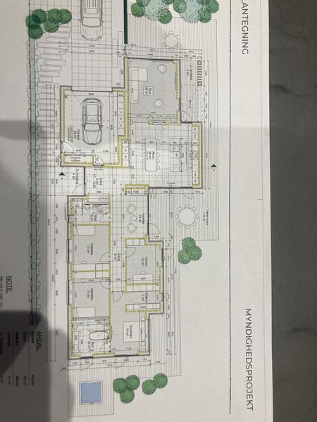 Nyt hus på 203 m2 hvor 16 m2 er badeværelser med klinker på næsten alt væg. Gips loft...