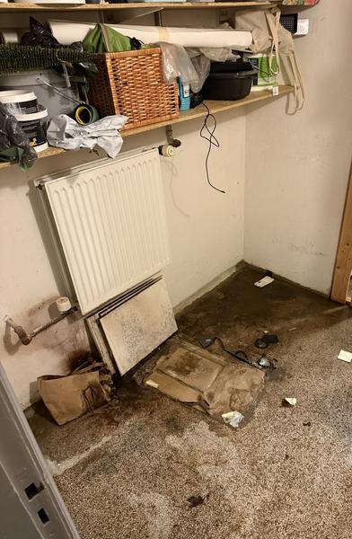 Jeg har haft en vandskade i et kælderrum, hvor en radiator pt. lækker vand (den “piss...