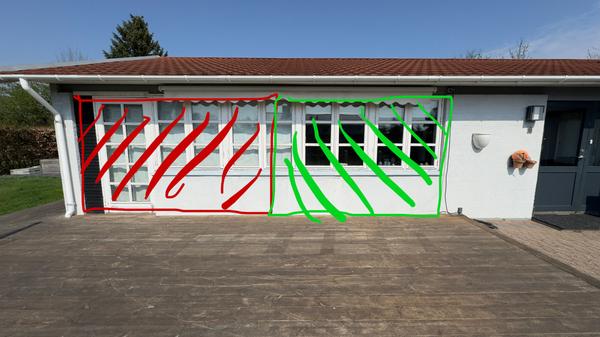 Ny foldedør er angivet med grønt. Det er vigtigt at oplyse, at vi ikke ønsker vinduer med sprosser fremadrettet og det skal være Alu/træ.
