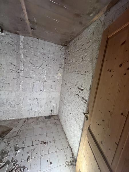 Alle tidligere fliser er fjernet og gulv og vægge står helt rå.