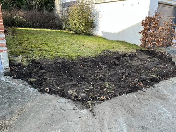 Vi har skrabet den gamle græsplæne væk, skal ha gravet væk og fyldt grus på så der er...