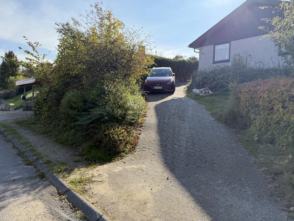 Vi bor på en skrående grund, hvor indkørsel er lavet på hældningen op mod huset. Vi v...