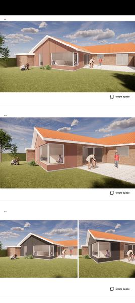Huset er 173m2 på nuværende tidspunkt. Tilbygningen skal være 22m2 og skal bygges af Viroc (fibercement plader). Der ligger på nuværende tidspunkt ligger der betontagsten, det skal der også lægges igen. Taghældning omkring 30 grader. Bygherre afventer med byggetilladelse, men bygherres arkitekt mener ikke det burde være et problem.