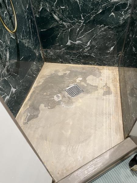 Montering af 2 store klinker 60x120 cm (har jeg selv) på gulv i brusekabine og montering af unidrain afløb.