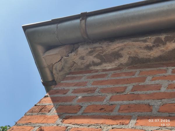 Jeg vil gerne have et tilbud på omfugning af en mur på ca. 25 m2 (billed 1) + reperation under tagrende (billed 2) + reparation af 5-6 små huller i muren rundt omkring på huset +