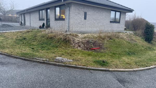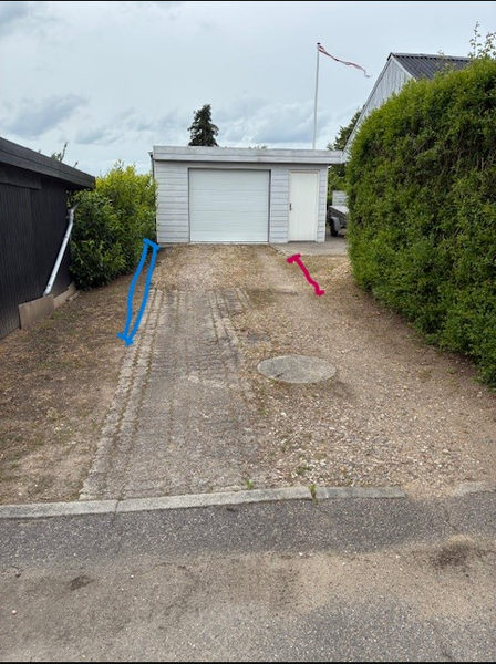 Der ønskes tilbud på at få gravet sokkel (blå) 20cm og dræn (rød) samt lavet indkørse...