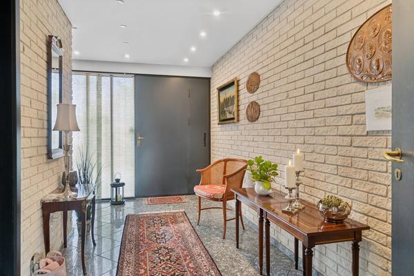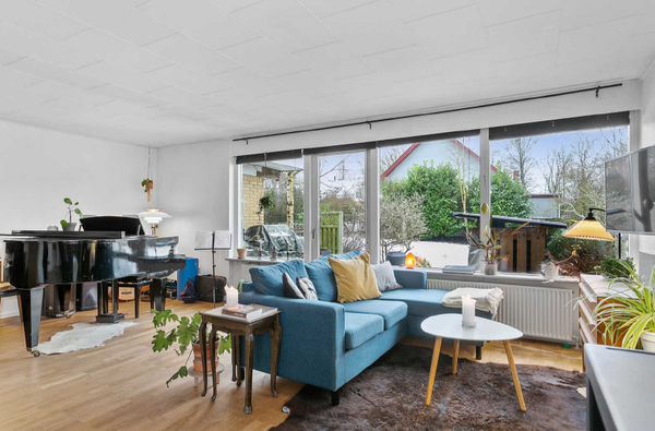 Store vinduespartier og to udgange: Én stor dobbeltdør ud mod fronten og én dør ud til venstre.