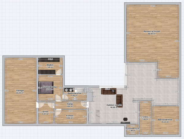 Vedhæftet findes arkitekttegninger + original tegning over grundplanen + tegning over kloakrør + vand installation I alt er tilbygningen cirka 85 m2. Vi er dog også interesseret i at få et tilbud på en anden mindre tilbygning, hvor vi ikke forlænger stuen men bare får lavet en "voksenafdeling" på cirka en 46 m2 hvor garagen også forlænges med knap 2 meter. Den har vi dog ikke arkitekttegninger af men jeg har selv skruet et billede af en grundplan sammen som også findes vedhæftet her.