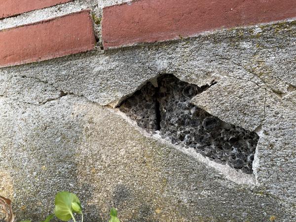 Hul og revner i sokkel. Jeg tænker at den skal mures op. Det er på hele gavlsiden og ...