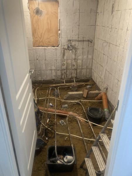 Badeværelset er 4 Kvm. Bryggerset er 7,8 Kvm. Mellemgang mellem de to rum er 2,8 Kvm. Jeg ønsker en løsning, der overholder gældende vådrumsregler og med korrekt fald mod afløb.