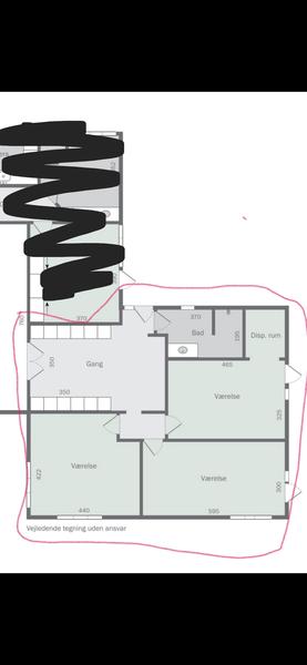 På den vedhæftede tegning er der markeret med rødt, 5 værelser og 1 stue, hvor vi ger...
