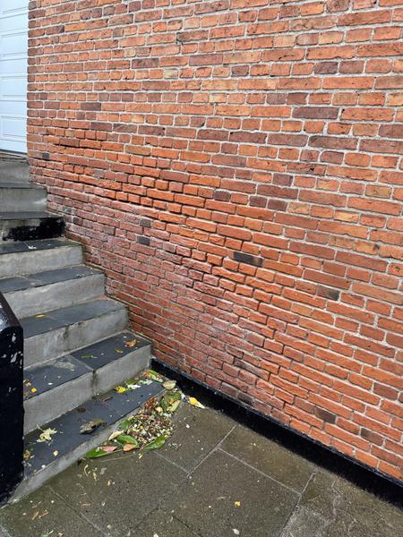 Mur har taget skade af vand fra trappe, og skal have lavet sokkel, som dækker fra dør...