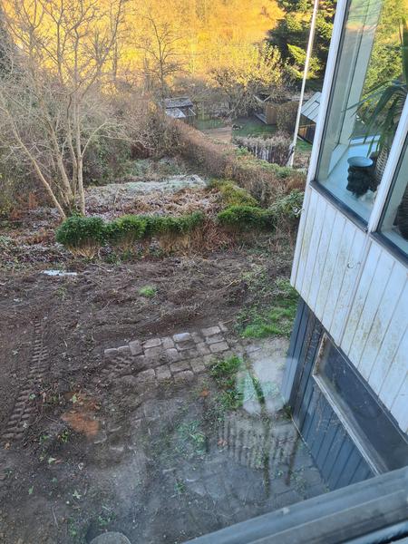 Selve terrassen med fliser er ca. 5,2 x 3,2 m. Der ligger i forvejen gamle fliser som er lidt ujævne. Jeg forstiller mig at terrassen kan lægges oven på fliserne, så de ikke skal fjernes.