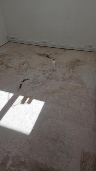 Der skal slibes gammel fliseklæb af først (jeg har slibet 1/3 af gulvet).