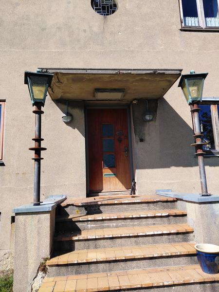 Nedrivning af armeret udhæng over hoveddør. Oppudsning/reparation af huller i væggen.