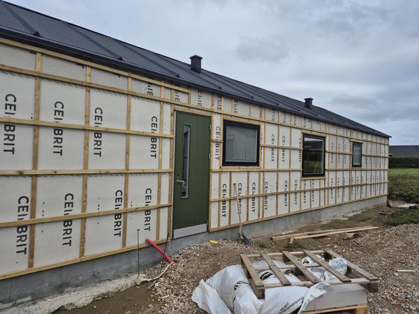 Udvendig beklædning af nyopført sommerhus i Gjellerodde. Står med vindplader og forsk...