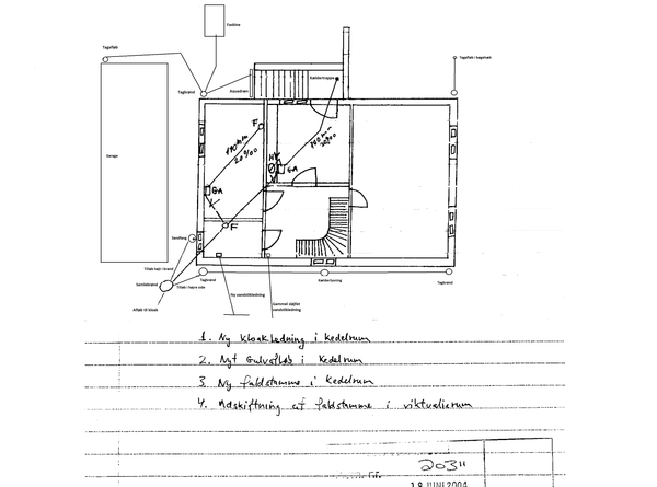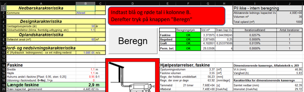 Der er lavet nedsivningstest flere steder og udregnet størrelser til faskinerne hhv. 1.5m3 og 3.5m3. På det vedlagte kort er markeret * røde cirkler, eksisterende nedløbsrør til kloak som skal enten lægges om eller sløfes helt * grønne cirkler, nye rør fra nedløbsrør til faskine skal etableres * grønne linjer, der hvor det er planlagt at rørene skal være under jorden * sorte firkanter, faskinerne selv. Disse overholder de funde afstandskrav, bortset fra afstand til nærmeste sø/vandløb som jeg har fået at vide, der kan laves en dispensation for.
