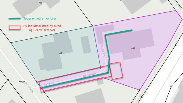 Vi skal derfor have gravet det vandrør ned helt ind til huset og tilsluttet huset istedet for den gamle vandledning (Grøn streg på billedet)