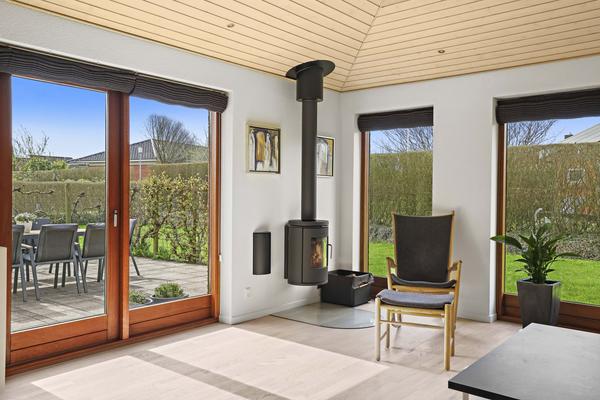 17 ruder i forskellig størrelse, tre terassedøre og en hoveddør.