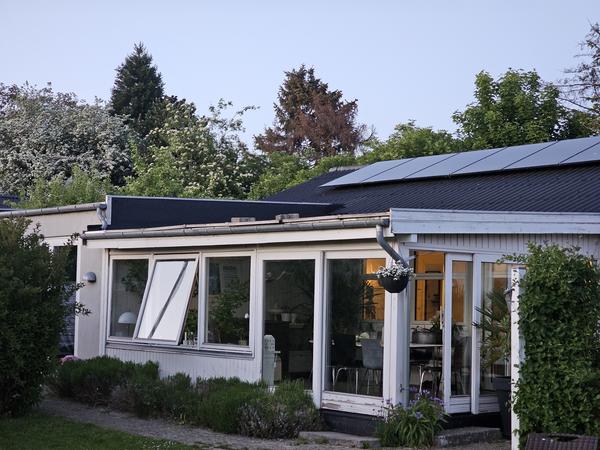 Tilbygningen ved siden af er lavet for 7 år siden og er med tagpap op imod husets eternittagplader. Havestuen kunne komme op i højden og forsætte samme tagtype så det ser mere sammenhængende ud. Måske med et par store glas partier i tagpaptaget så der stadig kommer masser af ovenlys ind. Loft til gulv vinduer hele vejen rundt og nogle store skydedøre som kan åbnes helt op.