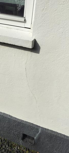 Pudset facade fremstår med revner , sandsynligvis fra sætningsskade.