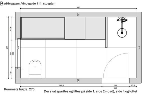 Fuldspartling og opsætning af filt i bryggers. Der skal spartles og filtes på side 1, side 2, side 4, den udvendige side af brusenichen og loftet. Der er et vindue i side 1 og en dør i side 4. Der er fliser på væg 3 og i brusenichen, så de skal ikke spartles og filtes. Rummet er ca. 6 m2