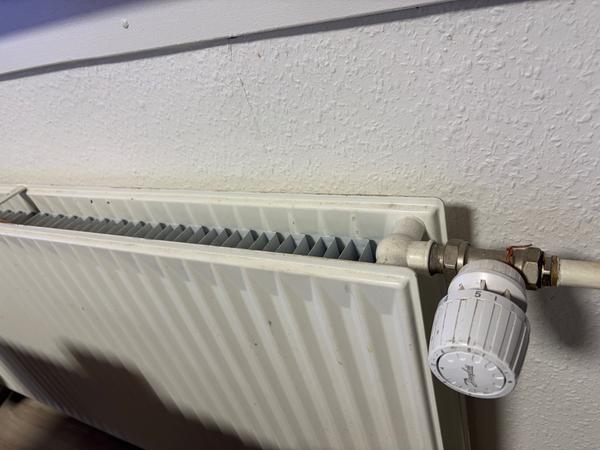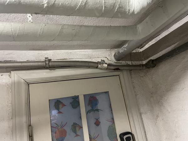 Der er to mindre lækager i loftet fra rørene, som fører varmt vand til varmeblæseren. I dagtimerne, når varmeblæseren kører og trykket er lavere, er der næsten ingen lækage. Men om aftenen, når varmeblæseren er slukket og vandtrykket stiger, begynder det at dryppe.