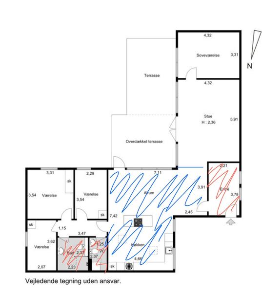 Jeg har vedhæftet en plantegning og markeres områderne med gulvvarme med rødt, og der område som har linoleum med blåt.