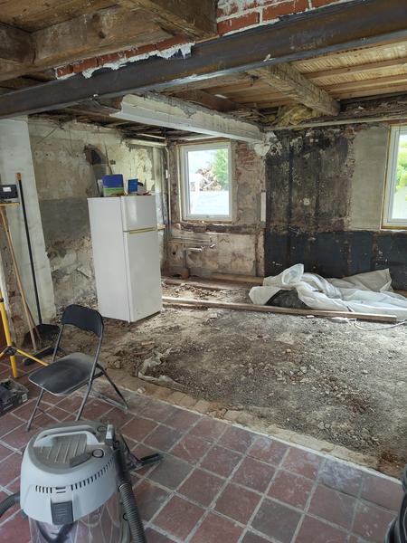 Lige nu er der klinker på den ene halvdel som umiddelbart skal have flydespartel, og køkkenet skal have fiberbeton / alm beton.