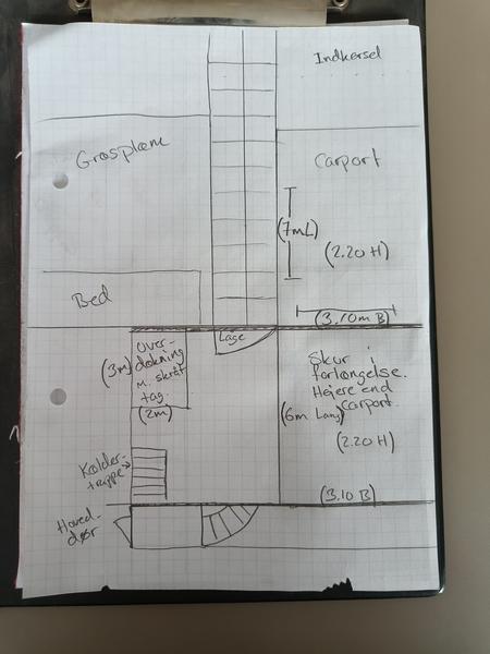 Skur i forlængelse af carport 6m lang x 3.10 bred. X 2.20 høj (på niveau 2)