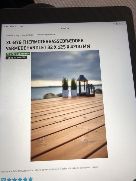 Bygge terrasse i træ. Måske 2 terrasser. Skal ned i højde så overkanten af af brædder ligger ovenpå sten. Jeg fjerner sten og graver ud til tværgående understøtning. thermoterrassebrædder 32x125x længde som i finder er bedst. Billede taget fra xl byg hjemmeside Skruer skal bare skrues i på toppen og ikke gemmes væk. Tilbud på hver sin terrasse og også et samlet tilbud.
