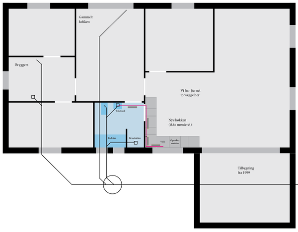 I forbindelse med etablering af køkken-alrum skal vi have ført vandrør og afløb ind til køkkenvask og opvaskemaskine. Køkkenet vil være placeret ved væggen mellem stue og badeværelse, og jeg formoder, rør kan føres her imellem. Lige nu er der en dør mellem stue og badeværelse, som skal blændes, så der bliver plads til køkkenet. Døråbningen kan måske lette arbejdet med at føre rør ind. Jeg har vedhæftet en tegning med et forslag, hvor rørene føres igennem hjørneskab og køkkensokkel hen til den gamle døråbning. Der bør være fin plads til fald i den høje sokkel. Herefter føres rørene ned i gulvet (8 cm beton), så de ikke spærrer for den nye døråbning. Jeg ved ikke, om det er en god løsning, og er bestemt åben for alternativer.