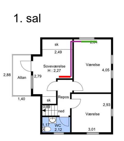 Jeg vil gerne have et tilbud på at trække rør til en ny radiator, i et rum hvor der ikke har været varmekilde før. I rummet ved siden af er der en eksisterende radiator. Så plantegning. Måske men kan trække rør fra den? Den grønne streg er den eksisterende radiator, den lilla streg er forslag til rør og den røde streg er der hvor den ny radiator skal stå. Da vi skal have nyt gulv i rummet hvor den ny radiator skal være, kan rør kører under gulvet der. De skal ind gennem væggen fra det andet rum.