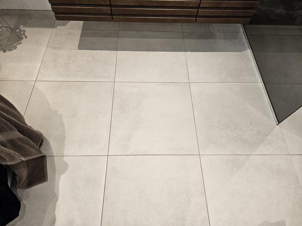 Der er et linjeafløb i midten, men ellers rummet kvadratisk og gulvet plant uden fald. Betondækket er slebet. Vi påtænker nogle standard 60x60 fliser.