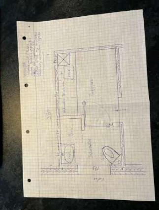 Toilet væghængt i venstre hjørne. Brus i højre side. Vask i højre side ud mod rum. Fliser i gulv. Skab i venstre side ud mod rum. Dør placeres ca 36 cm fra væg.
