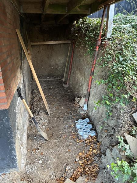 Opbygning af støttemur der skal kunne holde træterrassen fra at falde sammen. Det er ...