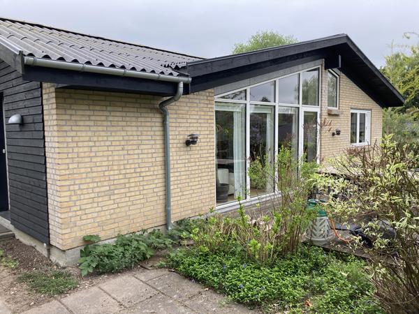 Omfugning af murværk på 70'er hus. Dårlig mørtel, delvist angrebet af murbier. Boligen er 213 kvm i ét plan. Med store vinduespartier.