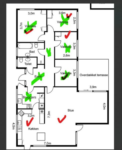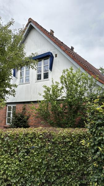 Længde på facade ca. 7 m på rækkehusets sydside, hvilket kræver et stillads, da der er ca. 5 m op til taget, da huset er i 2 plan.