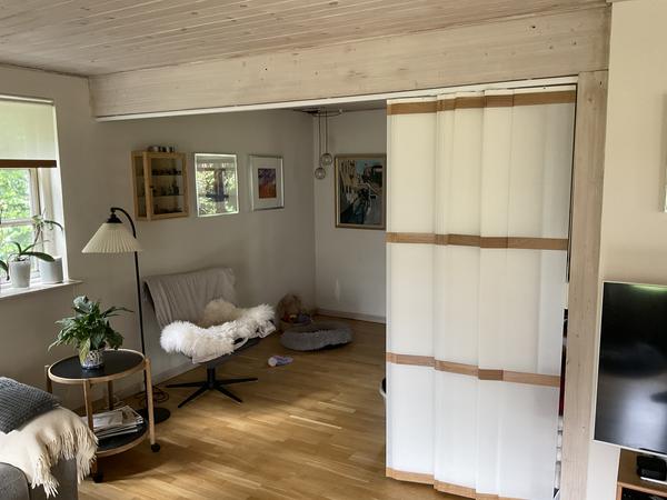 Opsætning af gipsvæg med indbygget skydedør. Væggen er ca 305 cm lang, der er ca 232 cm til loft og ca 210 cm op til bjælken.