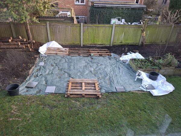 Skal havde lagt 194 stk. 20 x 20 x5 cm fliser i haven til underlag for drivhus. Der e...