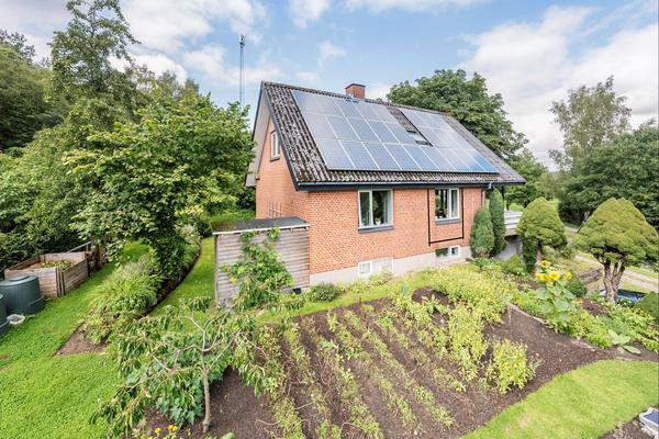 Det er svært for mig at sige præcis. Huset har et vægtet areal på 143 m2 og så er der også et udhæng på garagen af cirka 10 meter